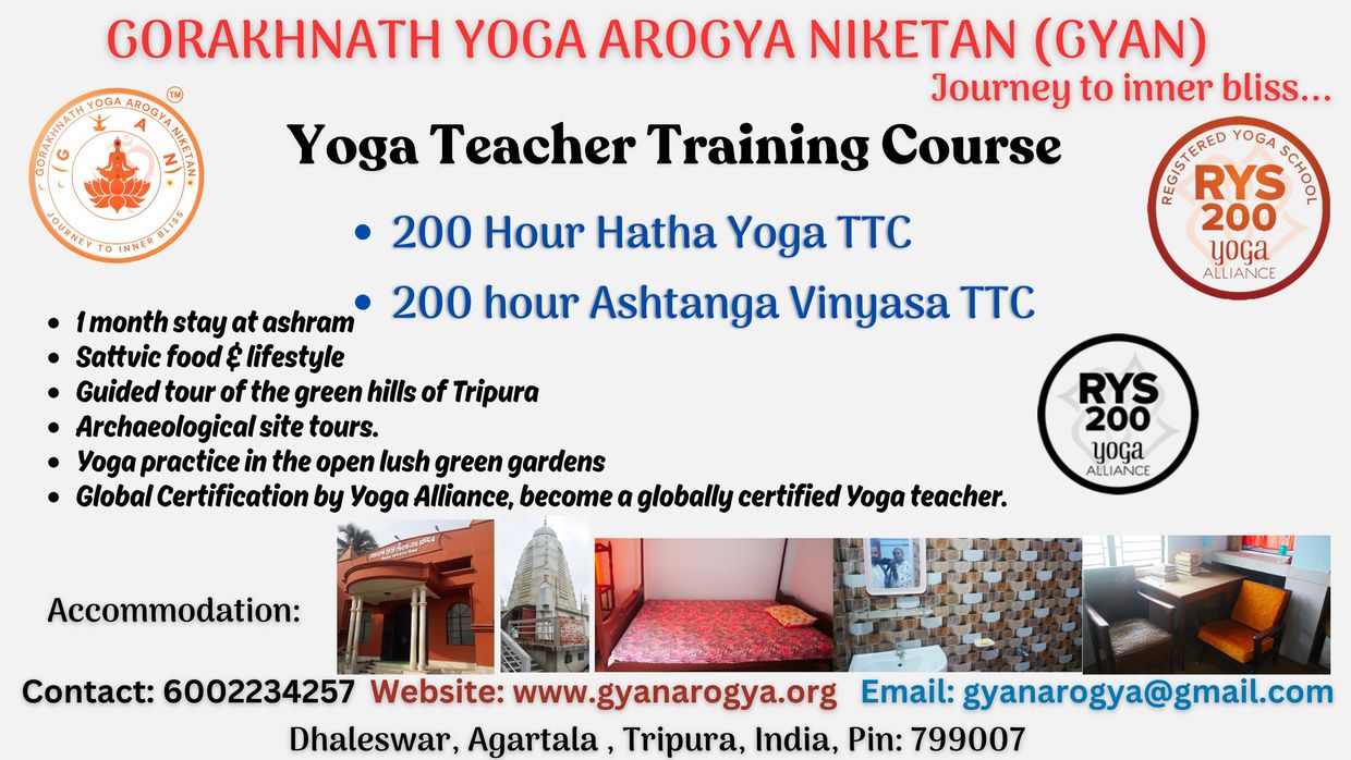 GORAKHNATH YOGA AROGYA NIKETAN(GYAN) offers the best 200-Hour Hatha Yoga Teacher Training Courses in Tripura, ideal for those seeking a deep and authentic foundation in traditional Hatha Yoga. This course is perfect for anyone looking to explore pure Hatha Yoga, with in-depth study and practice of key concepts such as asana, pranayama, shat kriya, sound, bandha, mudra, meditation and more. From this TTC one can acquire knowledge about Jnana yoga, Karma yoga, Bhakti yoga, Raja yoga.